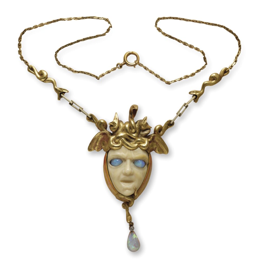 À côté de cette sculpture dont la symbolique et le contexte colonialiste de sa production choquent aujourd’hui nos sensibilités décoloniales, l’exposition au Belvue présente aussi un magnifique échantillon de bijoux témoignant de l’art de Philippe Wolfers. Ainsi, le pendentif Méduse (1898) associe or, émail, ivoire, opale et diamant. Pour la première fois, Wolfers intègre de l’ivoire à un bijou, y sculptant le visage effrayant de la gorgone dont les yeux d’opale évoquent le regard pétrifiant. Le pendentif Cygne et Serpents (1899) combine or, émail, opale, rubis, diamants et perle.