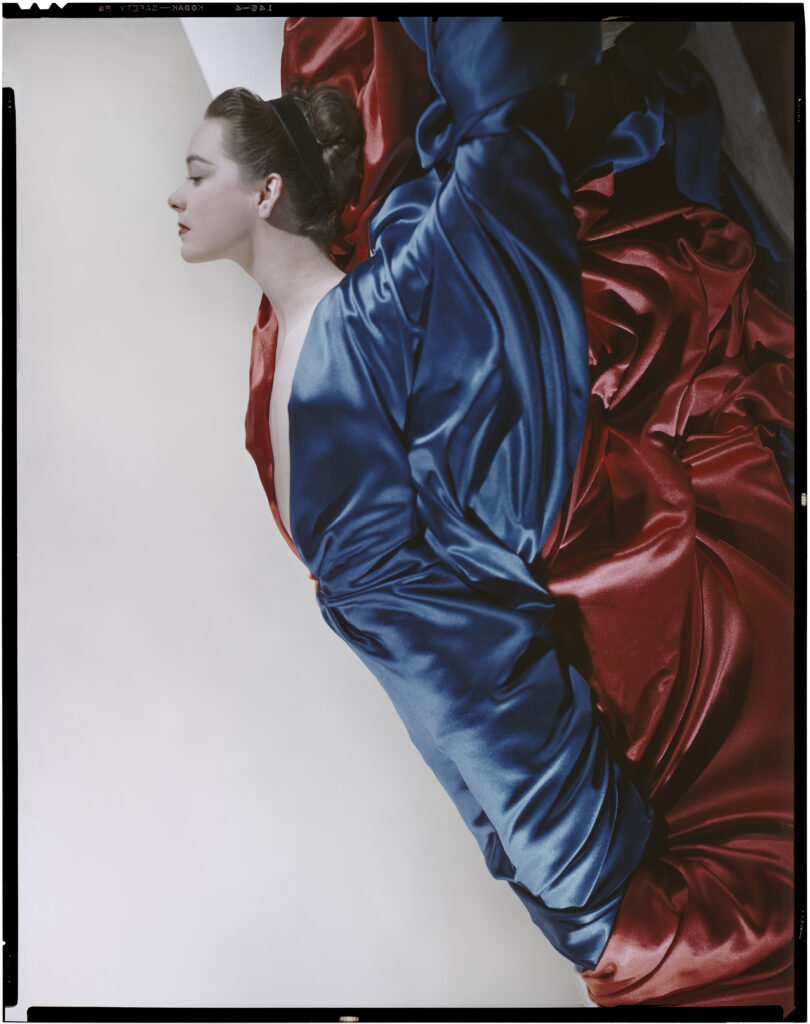 Les Blumenfeld arrivent à New York le 9 août 1941. Erwin commence à travailler pour Harper’s Bazaar. Sa carrière explose : installé dans son studio près de Central Park (1943) il devient l’un des photographes de mode les plus connus et les mieux payés. En 1944, il quitte Harper’s Bazaar et travaille en indépendant, réalisant les couvertures de prestigieux magazines, tout en répondant à de nombreuses commandes publicitaires. Acharné à imposer ses visions esthétiques aux directeurs artistiques de magazines commerciaux, il se flatte d’introduire « l’art en contrebande », poursuivant ses expérimentations artistiques autour du corps féminin et affirmant sa liberté créative dans l’exploration des formes, des couleurs et du mouvement. Il perfectionne ses techniques parisiennes pour élaborer un répertoire d’une grande originalité, caractérisé par la simplification des lignes et l’économie des formes. Son travail sur la couleur lui ouvre de nouveaux horizons. L’exposition montre un ensemble inédit de photographies de cérémonies des Indiens Pueblos du Nouveau-Mexique, prises lors de la fête annuelle de cette communauté et témoignant d’une grande proximité de Blumenfeld avec les danseurs dont ses images capturent les chorégraphies. Devenu citoyen américain (1946), ses photos figurent en bonne place aux expositions collectives du MoMA : In and Out of Focus: A Survey of Today’s Photography (1948), Color Photography (1950), Abstraction in Photography (1951). Puisant dans les arts visuels de l’Antiquité à la période moderne. il recrée parfois des toiles célèbres, comme La Jeune Fille à la perle de Vermeer, mais le plus souvent, ses allusions sont plus subtiles avec des modèles adoptant des poses inspirées d’icones de la peinture telles La Naissance de Vénus de Botticelli ou Les Poseuses de Seurat. Ses nus drapés traduisent sa fascination pour la sculpture.